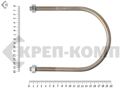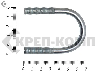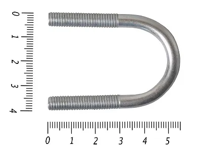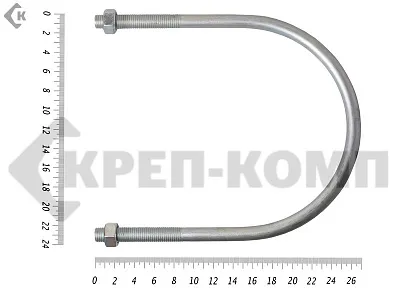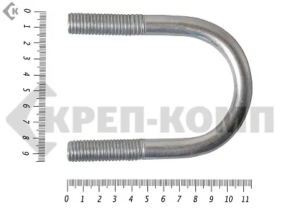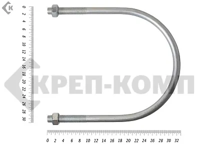 Хомут U-образный представляет собой изогнутый по определенному диаметру трубы стержень, концы которого снабжены метрической резьбой. Предназначен для фиксации труб при монтаже коммуникационных сетей. С его помощью можно производить эффективное закрепление к рабочему основанию стержней, электротехнического силового кабеля и прочих изделий круглого сечения. Жесткая фиксация реализуется за счет затягивания гаек на резьбовых концах стержня.